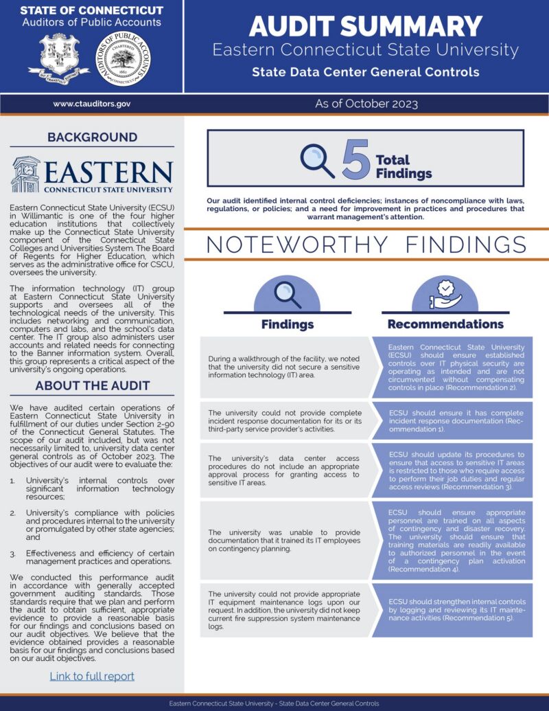 | 20260407 | State Data Center General Controls, Eastern Connecticut State University as of October 2023 | 04/07/2026 | Special Audit | ||